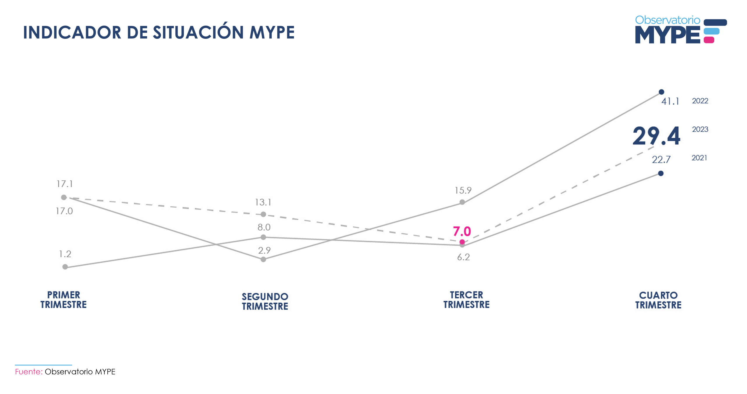 El 40.8% de los empresarios encuestados dijo que sus negocios tuvieron un buen desempeño en el último trimestre de 2023, mientras que solo el 11.4% opinó lo contrario. El Indicador de situación, que representa el porcentaje neto de empresarios mype con un buen desempeño en sus negocios, es del 29.4%. Esto se calcula restando los dos valores mencionados anteriormente.