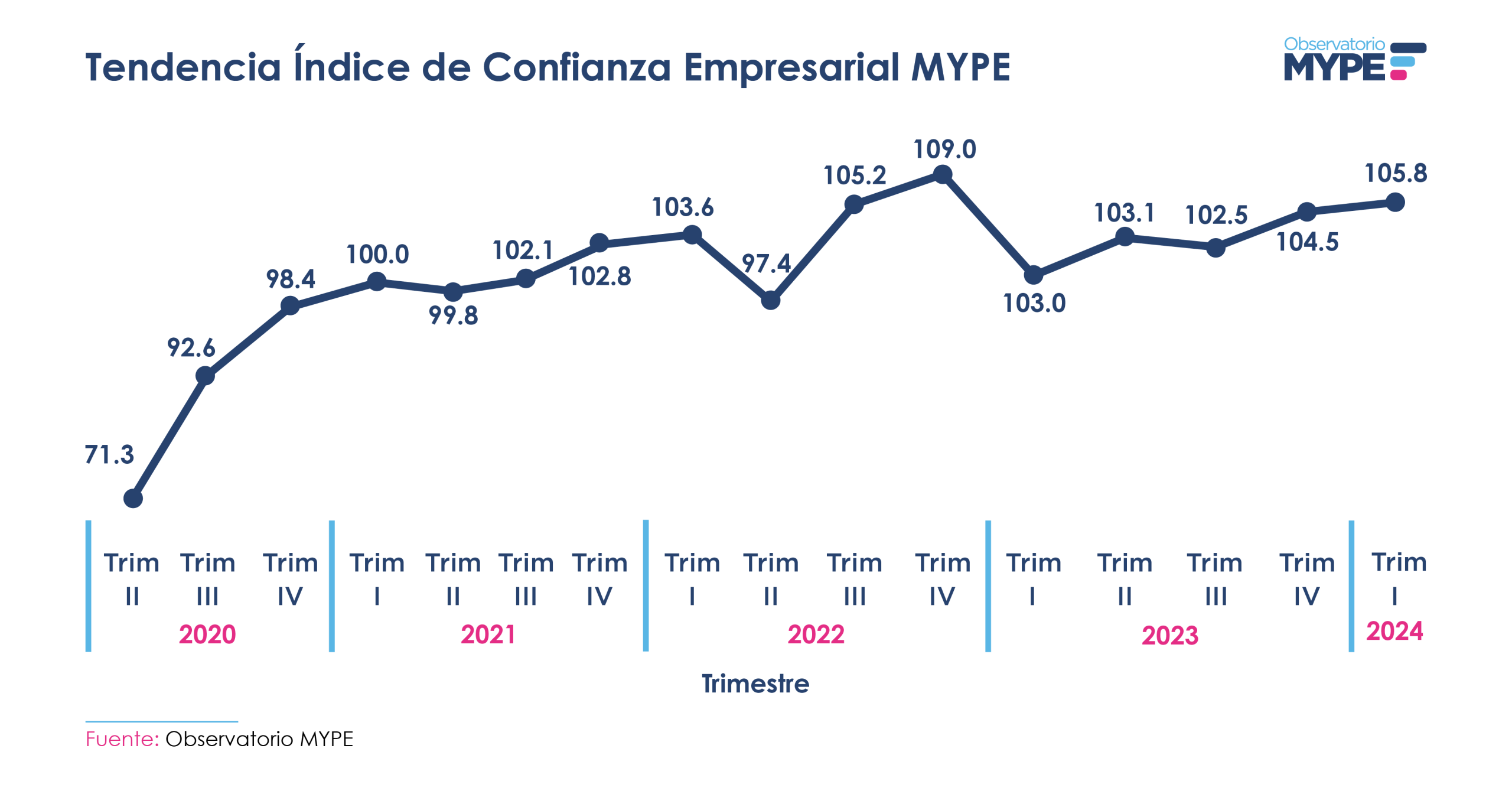 El reciente informe trimestral ofrece una visión alentadora para las MYPE, evidenciada por el aumento del Índice de Confianza Empresarial, que evalúa la percepción de los empresarios sobre la economía. Este índice ha crecido significativamente cerrando en 105.8, este puntaje refleja optimismo respecto al futuro económico y una confianza fortalecida, impulsada principalmente por expectativas optimistas a corto plazo y una mejor percepción de la situación actual en comparación con el mismo periodo del año anterior. Durante este primer periodo la proporción neta de empresarios con una opinión favorable sobre el desempeño de sus negocios fue de 24.8%, un incremento de 7.7 puntos frente al primer trimestre de 2023.