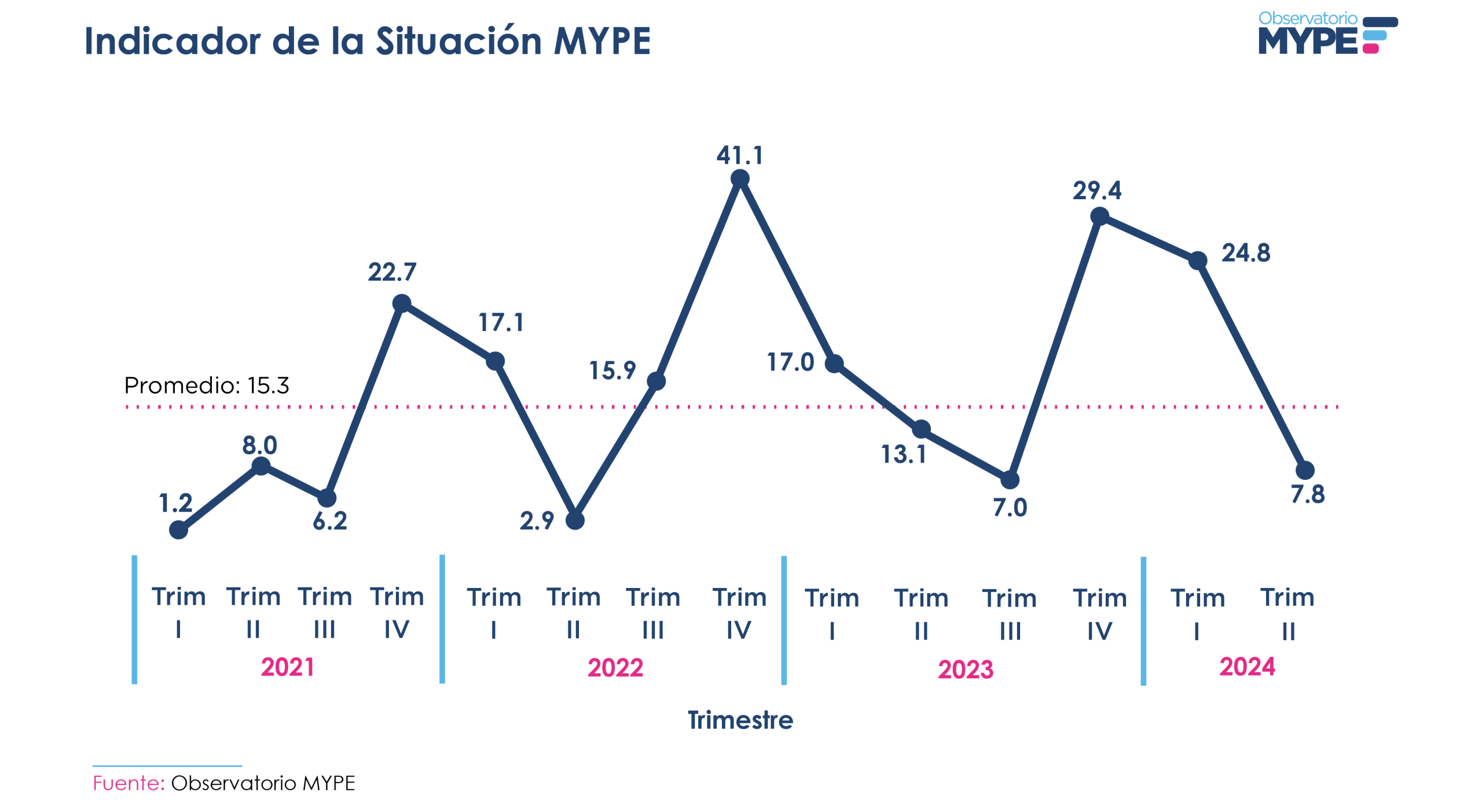 Para el segundo trimestre de 2024, el índice de situación empresarial se situó en 7.8 puntos, reflejando una situación desafiante (ver gráfico). Este índice comenzó el año en 24.8 puntos, mostrando fluctuaciones significativas debido a factores estacionales. Durante el último trimestre, el 31.4% de los empresarios MYPE entrevistados consideraron que el comportamiento de sus negocios fue favorable en comparación con el primer trimestre, mientras que el 23.6% opinaron que su situación fue desfavorable. Estos resultados indican que, a pesar de algunos momentos favorables, un porcentaje considerable de las MYPE enfrentan una realidad económica difícil.