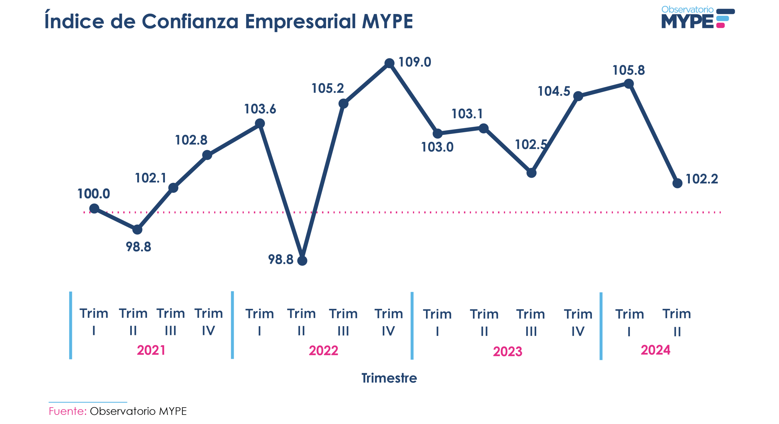 Los resultados del informe del segundo trimestre de 2024 revelan un período adverso para los empresarios del sector MYPE. El Índice de Confianza Empresarial cerró en 102.2 puntos, representando una disminución de 3.6 puntos respecto al trimestre anterior. Este puntaje sugiere que la situación económica percibida por los empresarios no es muy favorable, y acercarse a los 100 puntos indicaría una situación muy mala.