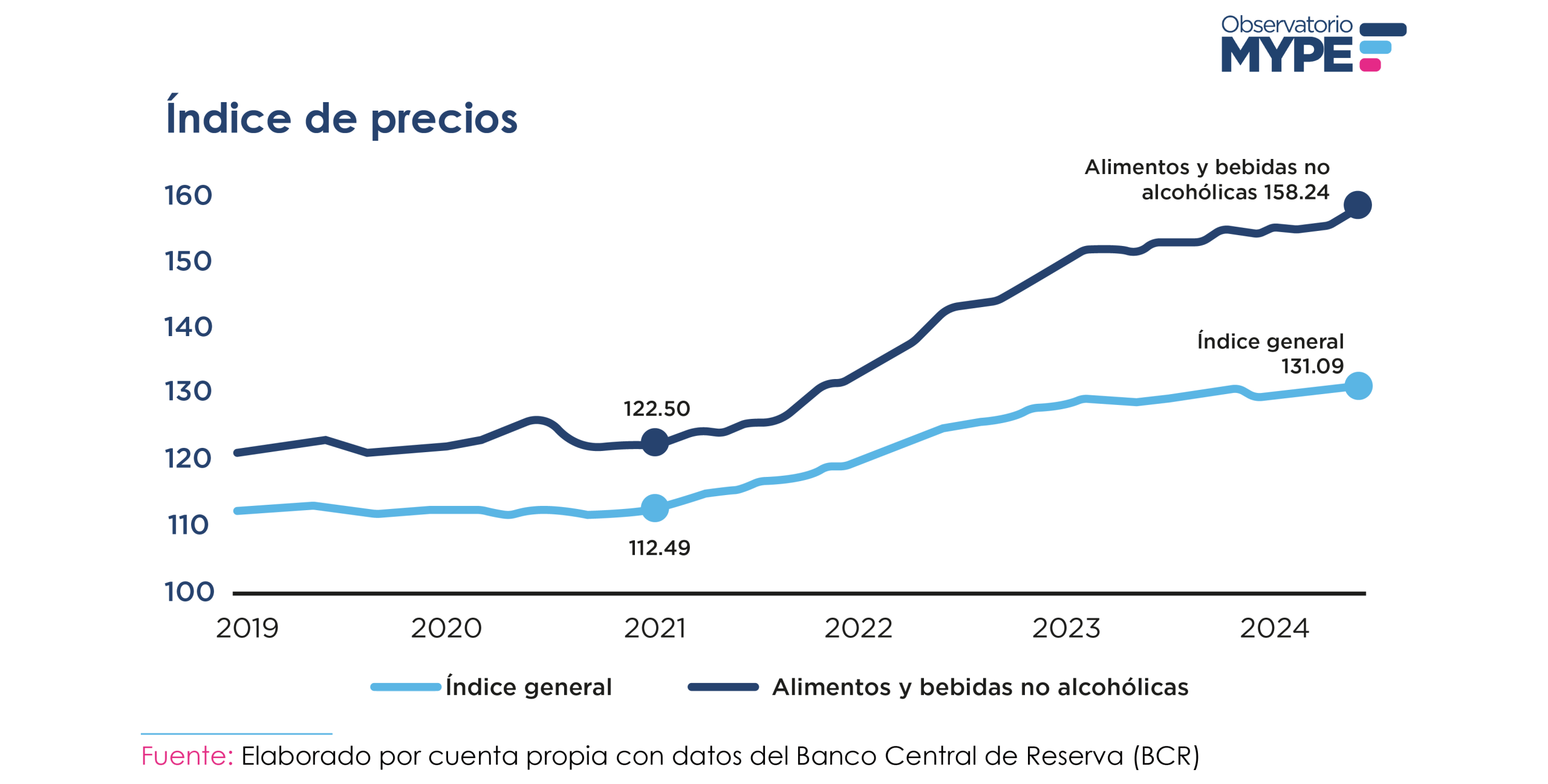 A nivel nacional, la inflación ha seguido una tendencia alcista por tercer mes consecutivo en este año. Según el Banco Central de Reserva (BCR), luego de 2021, se ha observado un notable aumento en el índice general de precios, especialmente en alimentos y bebidas no alcohólicas. Desde 2021, la inflación acumulada ha sido aproximadamente del 18.78% en precios generales y del 30% en alimentos y bebidas no alcohólicas (ver gráfico).