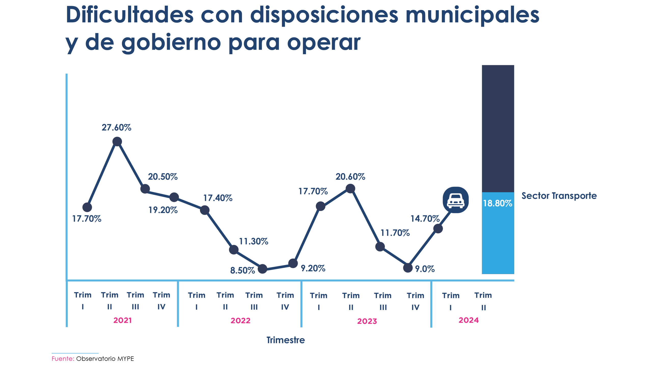 Es importante resaltar que para el segundo trimestre de 2024, las regulaciones municipales y gubernamentales también han impactado significativamente al sector de transporte, por tercer trimestre consecutivo. En este período, el 18% de los empresarios reportó dificultades relacionadas con la normativa. Este aumento en los desafíos regulatorios podría sugerir la necesidad de una mejor colaboración entre el sector y el Gobierno para crear políticas que beneficien a los empresarios sin entorpecer sus operaciones. “El IVA y otros impuestos nos afectan significativamente,” comenta Dalila. “A veces, el margen de ganancia apenas cubre los costos.”