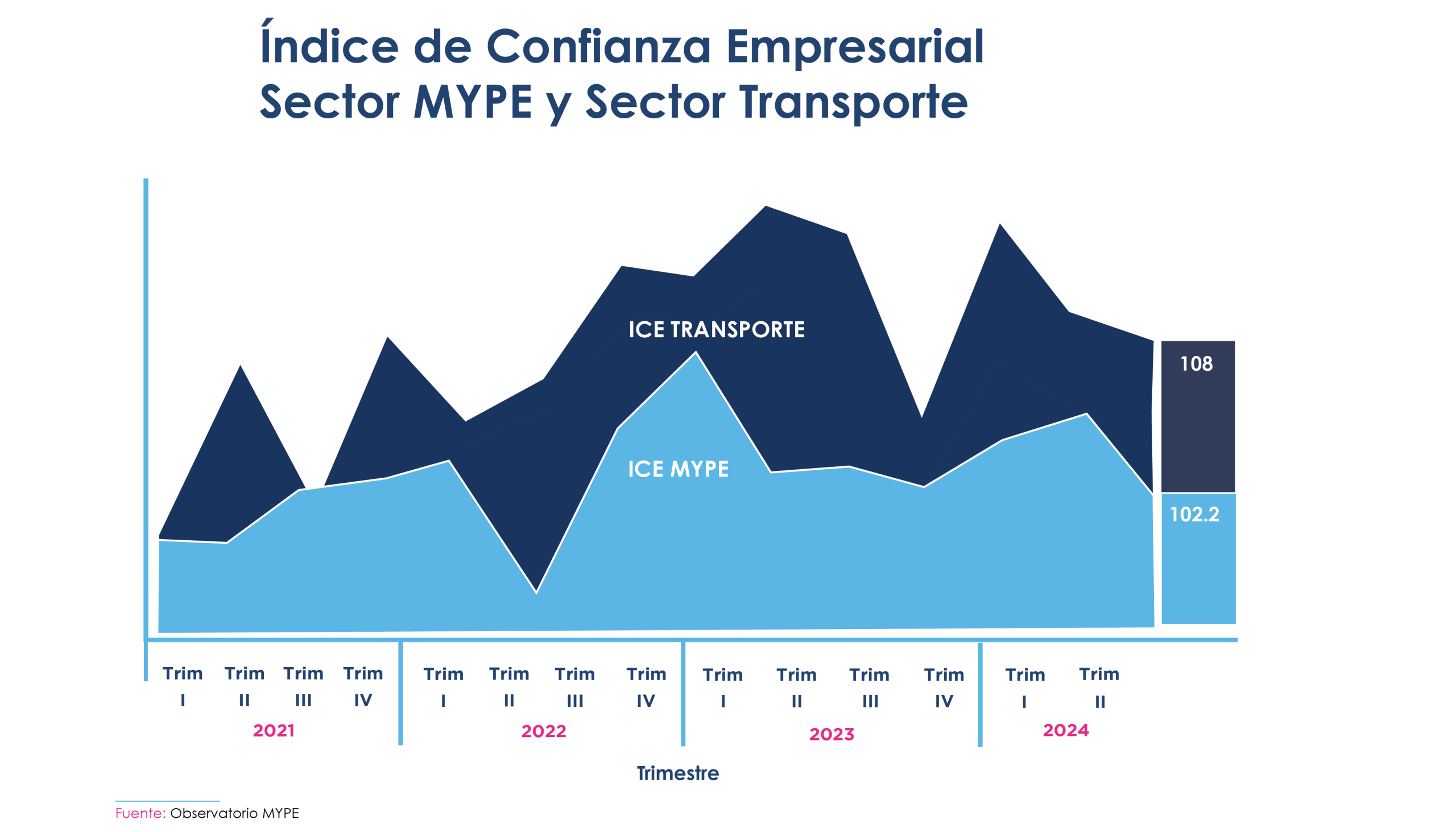 En el trimestre correspondiente a los meses de abril a junio de 2024, el Índice de Confianza Empresarial para el sector transporte cerró en 108, posicionándolo como el segundo sector con mejor desempeño y con un puntaje superior al promedio obtenido por todo el sector MYPE.