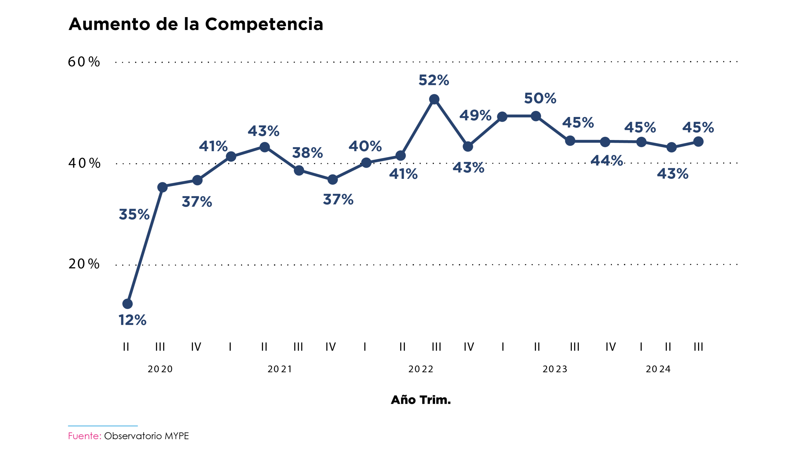 No obstante, el dinamismo del sector sigue estando limitado por la fuerte competencia, un factor que ha permanecido constante durante el último año. Desde el tercer trimestre de 2023, cuatro de cada diez empresarios han señalado un aumento en la competencia dentro del sector. Esto podría estar relacionado con la mejora del clima de seguridad en el país, que ha facilitado la aparición de nuevos negocios y, en algunos casos, la entrada de medianas y grandes empresas en el mercado.