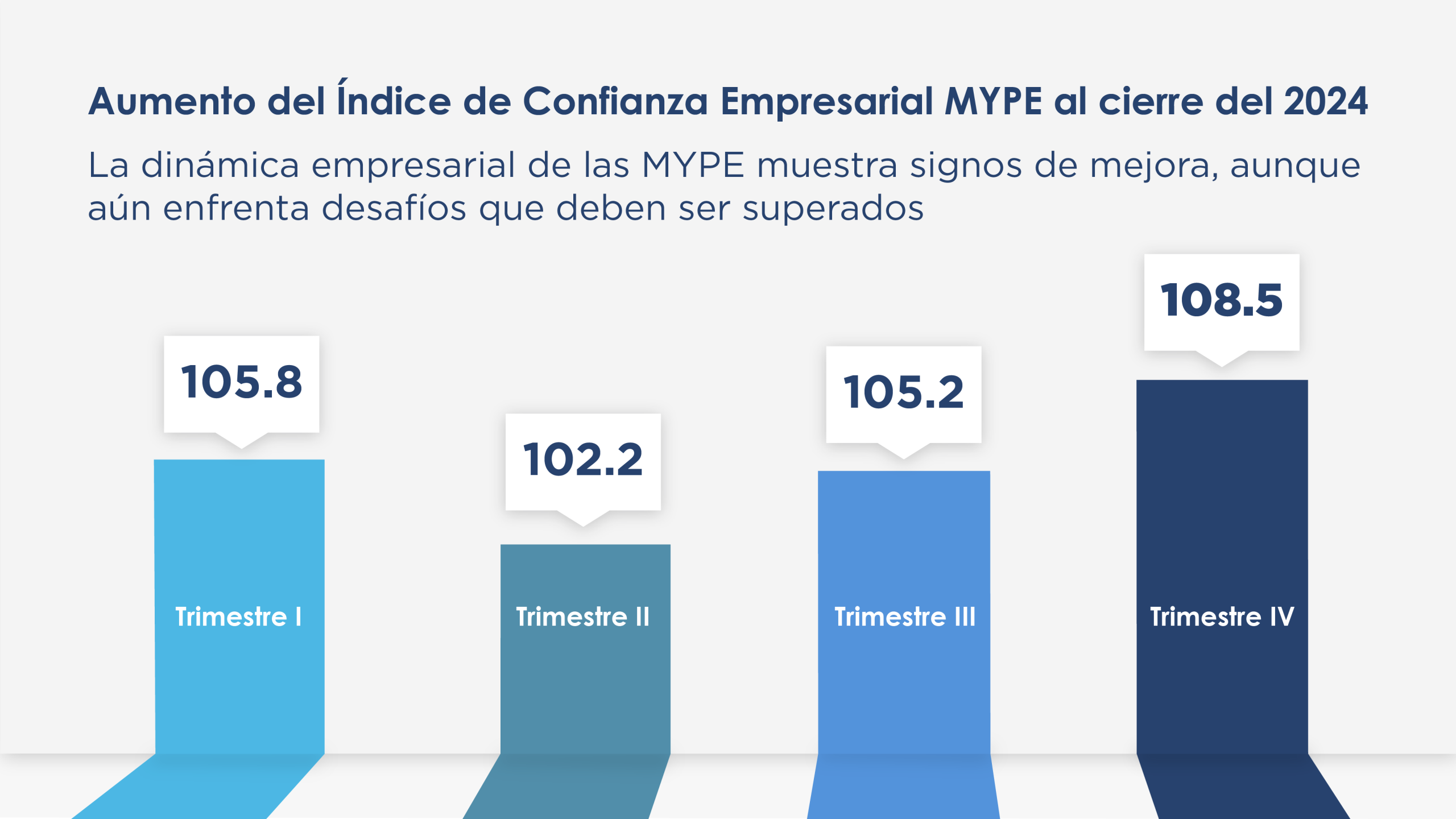 El más reciente informe de Dinámica Empresarial MYPE para el cuarto trimestre de 2024 muestra una mejora en las expectativas de los micro y pequeños empresarios. Al cierre de dicho período, el Índice de Confianza Empresarial alcanzó los 108.5 puntos, lo que representa un aumento de 3.1 puntos respecto al trimestre anterior y una mejora de 4 puntos en comparación con el cierre de 2023.